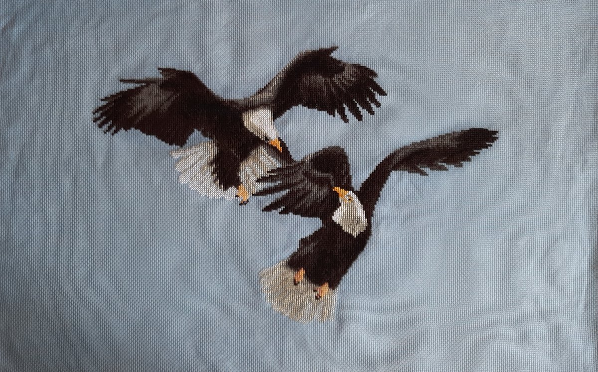Готовых отшивов не нашла, но решила рискнуть, т.к. уже вышивала животных этого производителя. Белую 14 канву из набора заменила на отличную 11 голубую гамму, чтобы придать орлам большей внушительности и драмы. Фон и бекстич не делала.Размер картинки получился 47 х 32 см, 15 цветовмулине бестекс.Работа хорошо смотрится с трёх сторон.))