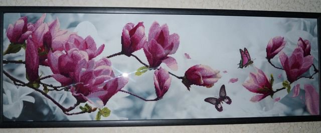 это частичная вышивка крестиком,китайский набор.рисунок нанесён на канву,вышивать очень легко.нитки ДМС,32 цвета-получается эффект 3-Д