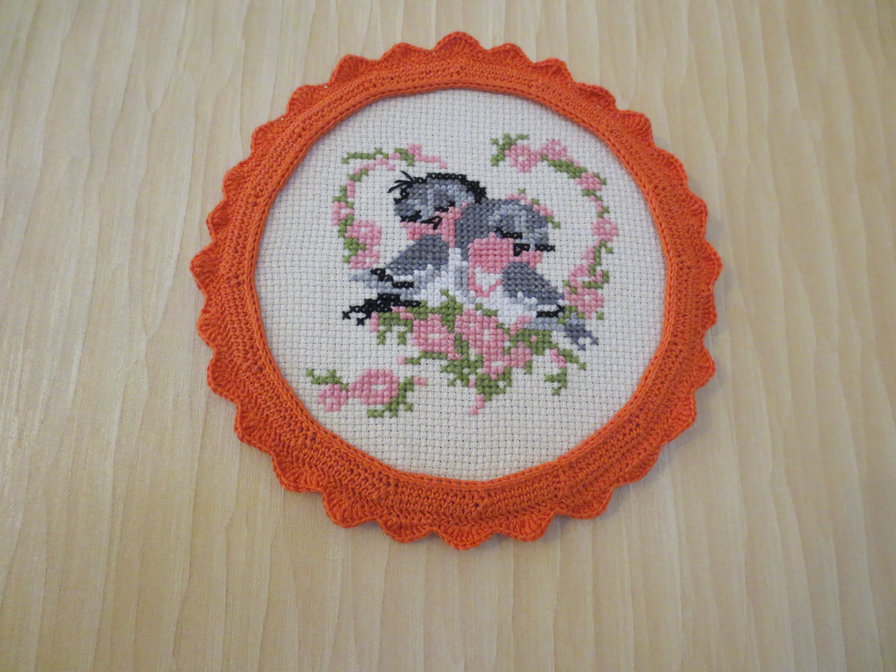 моя первая работа - подарок сыну с невесткой на 5 летний свадебный юбилей ! канва из старых запасов номер не знаю, нитки DМС вышила быстро, рамку связала крючком.