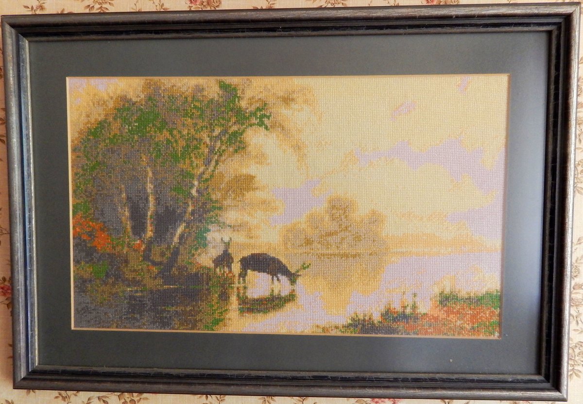 Работа сделана по схеме журнала "Домашняя коллекция" из Санкт-Петербурга.Работа в готовом виде (без паспарту и рамки) - 35х21 см.;Канва - Аида 18;Количество цветов - 21;Марка ниток - DMC.