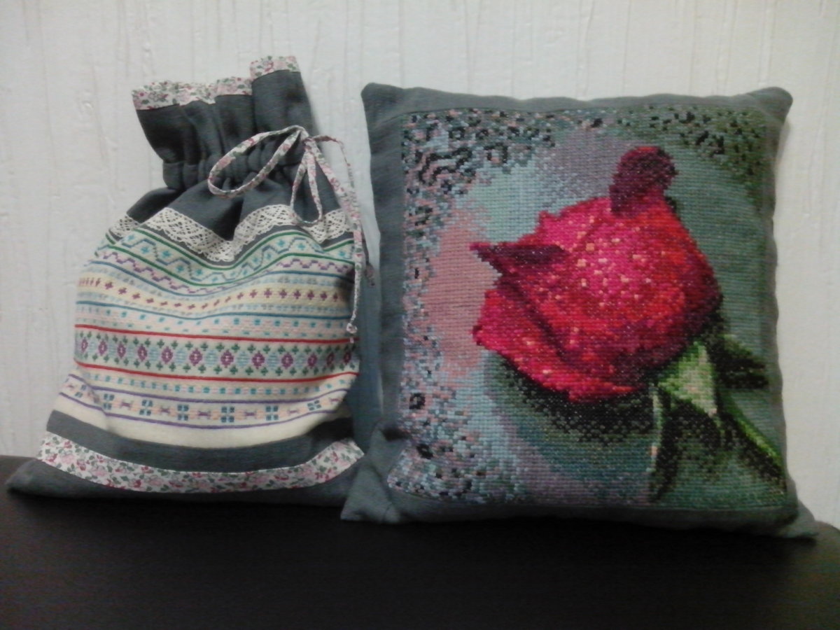 Вышивка «Подушка с розой и мешочек для рукоделия»