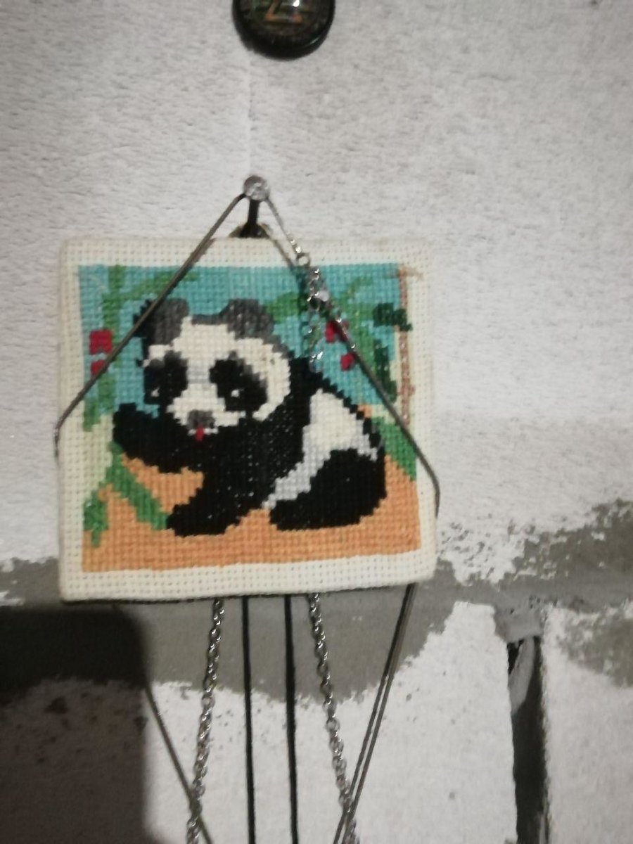 Самая первая, бедная-несчастная пандочка, которая сперва упорно становилась зеброй. Ниток не хватило, в условиях дачи в глухомани пришлось доделывать чем было.