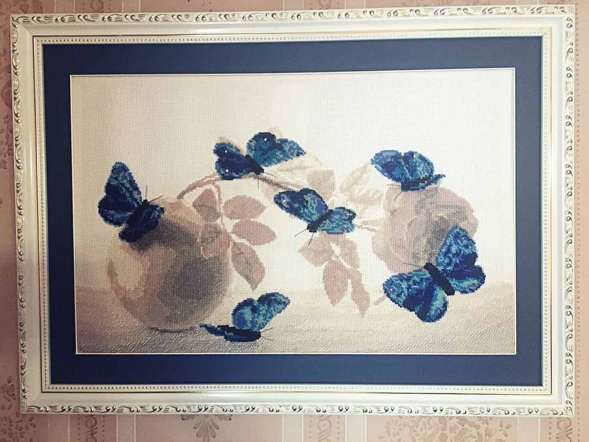 Мулине(роза, ваза и стол) и бабочки вышиты бисером, фон - канва.