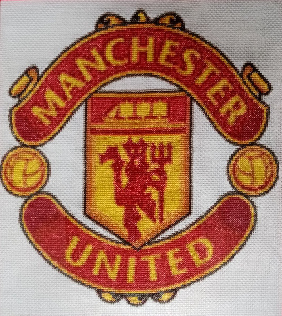Вышивала в подарок зятю, фанату МЮ. Фон просили не вышивать, так и сделала.