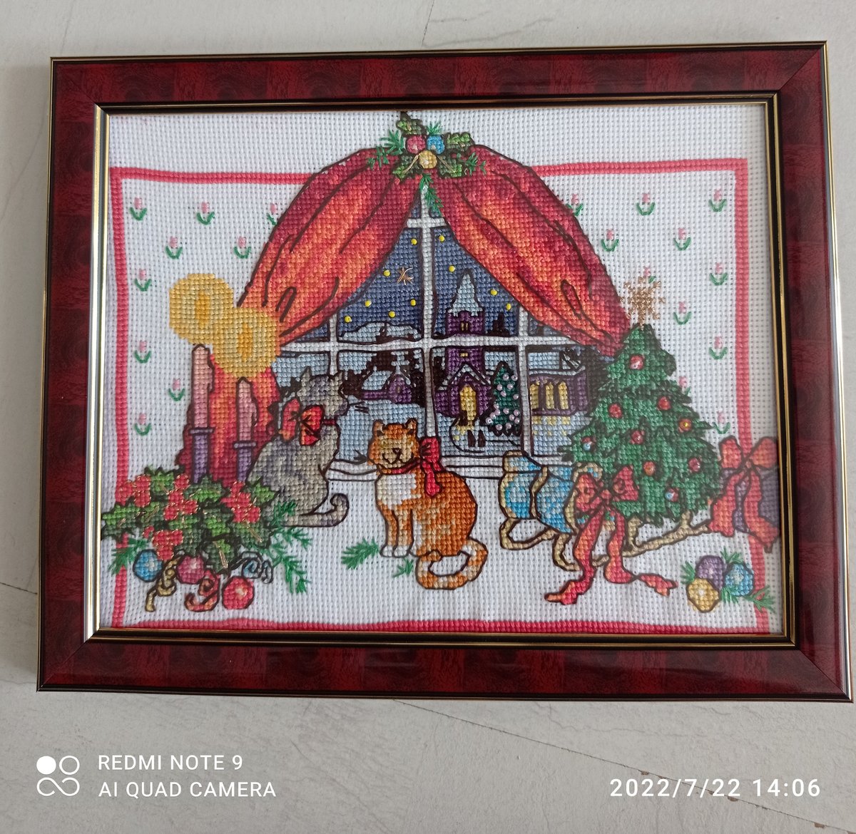 Моя самая первая работа. Лежала наверное лет 10... Вышить вышила, а вот обвести котиков, шторы и т.д. было лень. И вот недавно я решила все таки закончить ее. Первая работа с которой столько мороки, в плане обшивки, никогда раньше не обшивала контур, но получилось неплохо.. На обшивку ушло 3 дня. 31 оттенок + 1 металлизированный + бисер. Размер картины 25*9.5 см.