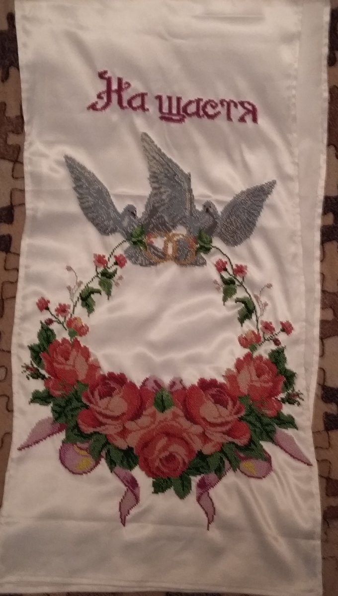 Вышивала его для одной из дочерей. Атлас с нанесенным рисунком под вышивку бисером. Первая сторона.