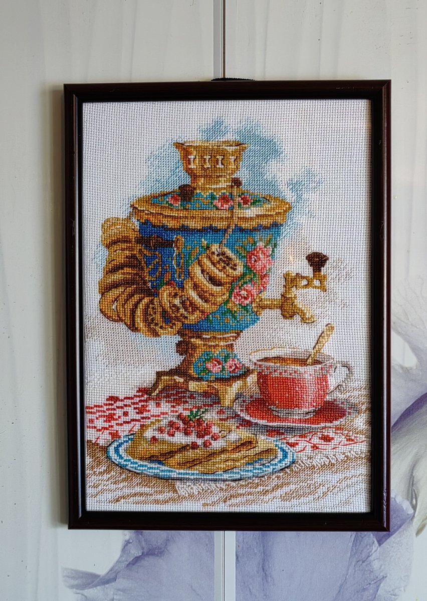 Ооочень лёгкая была вышивка. Прям какая-то деревенская, от неё веяло ностальгией))) Поэтому закончила очень быстро, вышивалась в удовольствие. Заняла достойное место на кухне над столом. Было очень жалко с ней расстаться