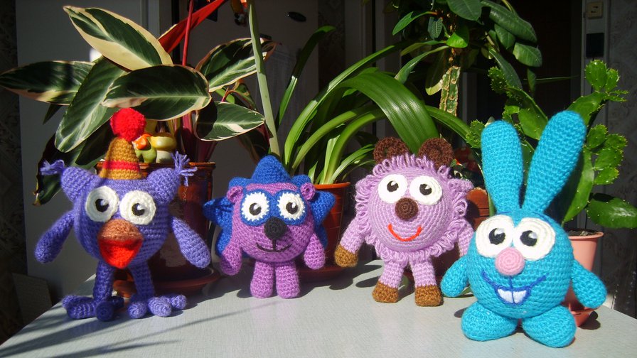Коровку Клару я вязала с сайта Одноклассники,гномов по Бурде (к сожалению сканера нет,но я как-то сканировала,надо поискать).Тигрика вязала с сайта Осинка.Смурфик и Лунтик чужие авторские работы,надо поискать если описание сохранилось,скину.Только адрес мне скинь.А смешариков сейчас залезу ссылочку кину.