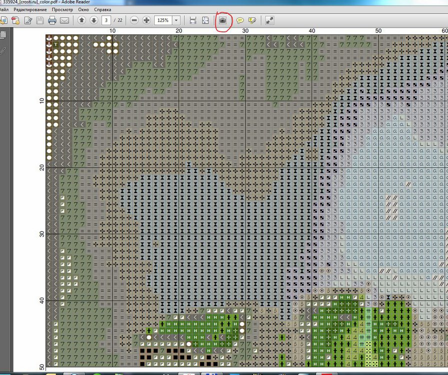 Теперь о том как я перевожу схемы, полученные с этого сайта к себе на комп. Для этого понадобится две программы. ПМ у нас уже есть. Нужен еще PDF-reader. Я пользуюсь Adobe Reader XI. Открываем с помощью PDF-reader скачаную схему. Страница с предпросмотром нас не интересует. Страница с легендой - я её до начала процесса распечатываю и немножко с ней работаю. Вылавливаю "одиночки" и рядом с ними рисую символ цвета, на который буду их заменять. Переходим к третьей странице, где уже собственно начинается схема. На панели инструментов ридера выбираю кнопку с фотоаппаратом