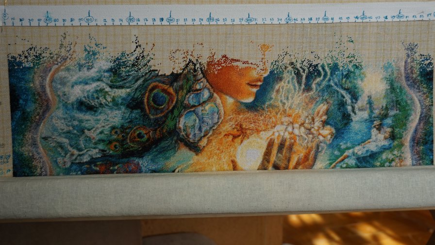 решила сегодня сфотографировать на фотик, показываю, что получилось.. Может потом сделаю склейку со скрином, но мне и так видно, что идет полное соответсвие с ним ))) И даже перья, где я раньше считала, что получается темнее, сейчас при большей площади зашитого уже мне все нравится... разглядывая тот участок.. я прям вижу как течет вода.. и это глубина..