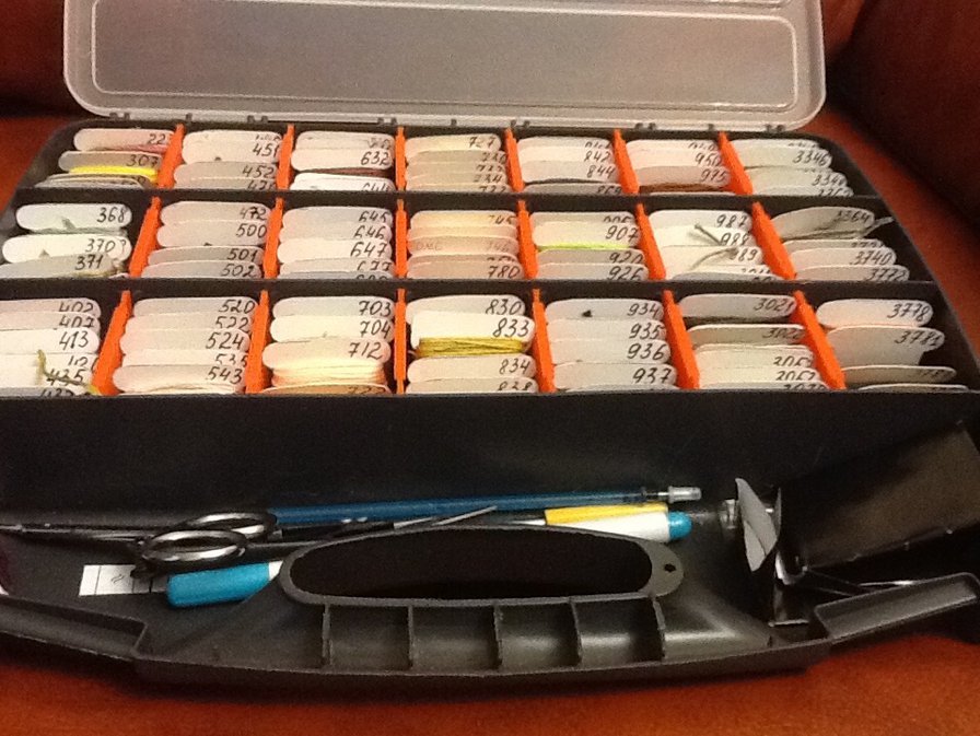 Для этой работы мне понадобилась лупа. Естественно лампа на раму. На рынке купила очень удачный органайзер. Он идеально подходит для бобинок.
