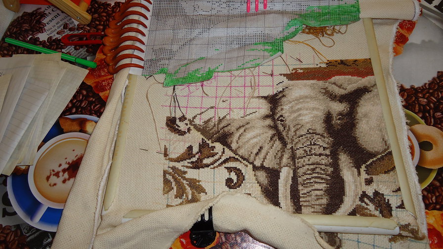 остался один цвет, которого не хватило и я его заменю на похожий так как нигде его нет :( а пока по схеме идет бэк, это моё первое с ним знакомство и похоже не очень...толи к этой картине он не приглянулся толи он у меня жутко кривой. в конечном итоге бэк распускаю, муж настоял что без контура слон ему нравится больше! вот как оно выглядело: а вы как думаете?