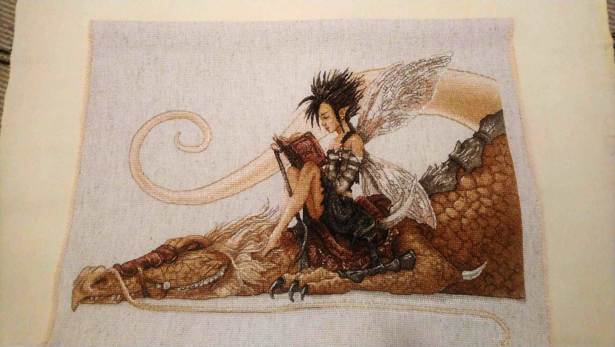 ДОБРОГО ВРЕМЕНИ СУТОК ВСЕМ! Вот и закончилось мое первое "волшебное путешествие" в мир фэнтези и сказок! Работа над эльфиечкой закончена! Как всегда были внесены некоторые изменения: 1. Бэк на хвосте дракона сделала чуть ярче и, скорее всего, это не бэк получился, а что-то вроде стебельчатого шва как в глади. Потому что старалась шить между дырочек, чтобы не было видно разрывов. 2. В местах не особо значимых как тело или лицо, там где нужно было шить по 2 вертикальные или горизонтальные петитинки одного цвета - шила полный узкий крестик вертикально или горизонтально - эффект тот же, мороки меньше. 3. Это скорее всего НЕ изменение, а способ - если шила длинный бэк (2, 3 см длина), то шила его по принципу выкладной нити, тогда бэк не провисает. 4. С французскими узелками не дружу, поэтому использовала бисер.