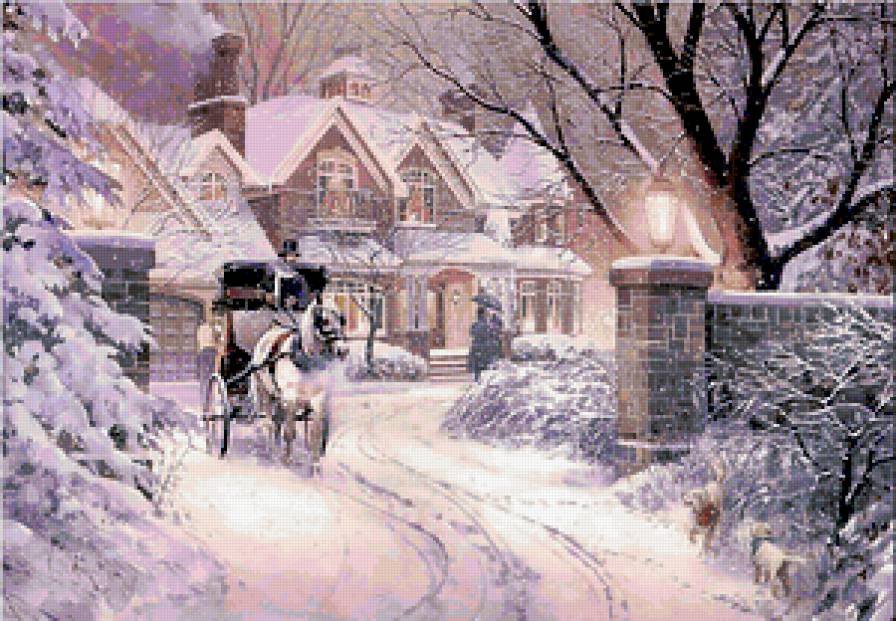 Выскажу свое мнение! Хотите слушайте, хотите нет! Нужно увеличить размер хотябы до 400 крестиков по большей стороне, собаки лошадь и корета требует бекстича (так они будут четкими и выразительными), дым от трубы слева фиолетогого цвета нужно заменить на цвет который повыше и посветлее! И Можно вышивать!