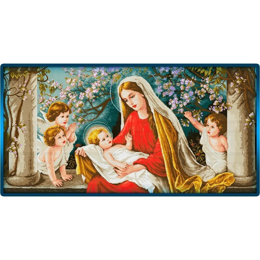 Изображение Мадонны с ребенком – самый сильный оберег в этой области. Церковные мотивы считаются благосклонными к беременным женщинам. Иконы – оптимальный выбор, они способствуют семейному счастью и рождению здорового ребенка. Если вы вышиваете во время беременности, стоит особое внимание обращать на цвета багета и паспарту. Желание оформлять созданный шедевр в определенной стилистике и цветовой гамме может многое подсказать о поле будущего малыша.