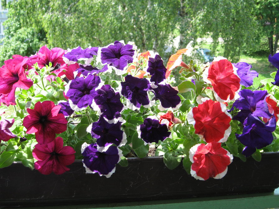 Петунии. Летом просто водопад из этих цветов.