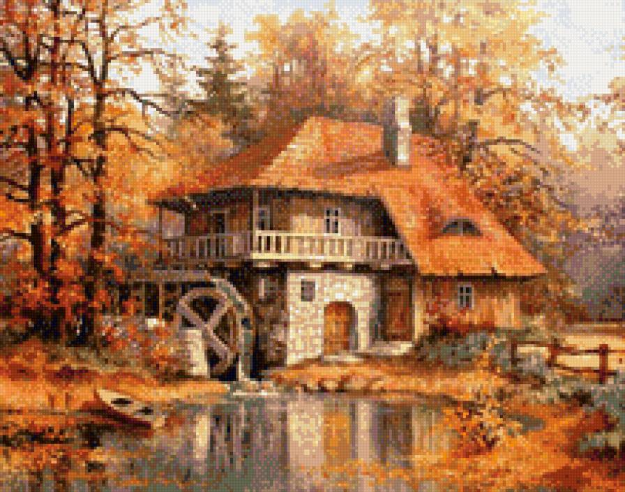 Теги: пейзаж, дом, лес, река, мельница, осень.