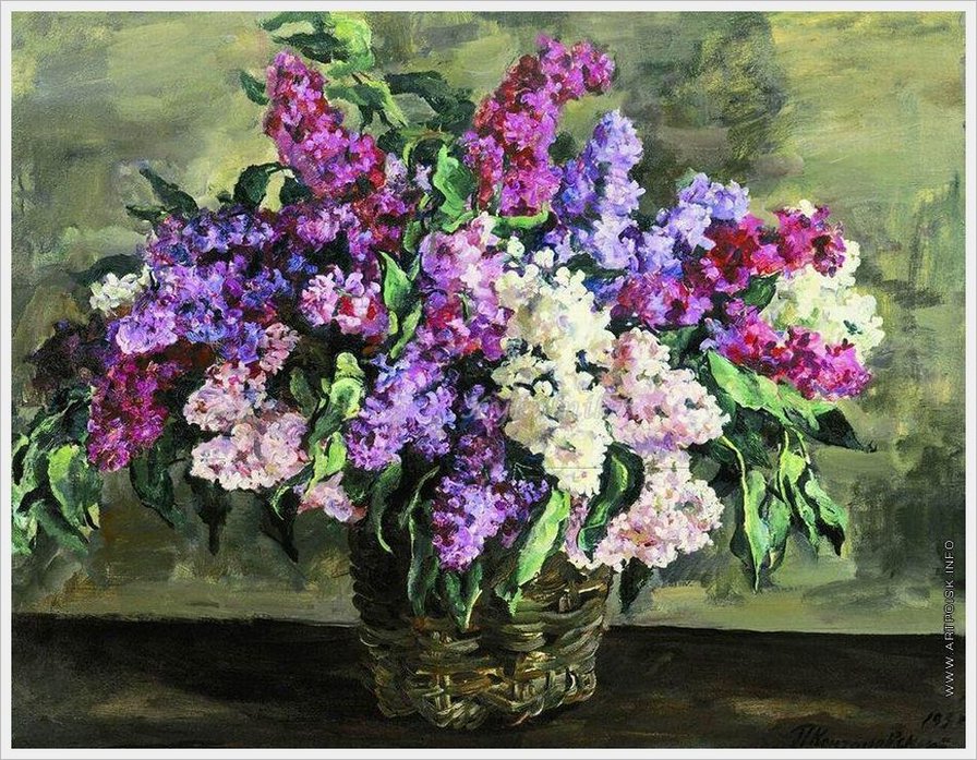 1933 год. Кончаловский Петр Петрович (Россия, 1876 - 1956) «Натюрморт. Сирень в корзине ('героическая')» масло холст 79х104