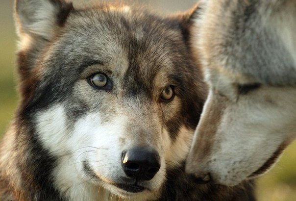 I love the way the wolf on the left is looking at the wolf on the right. Precious. ++++