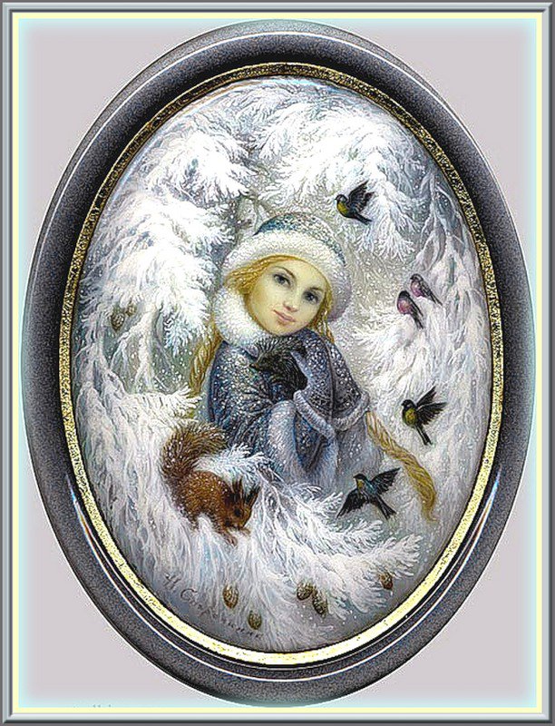 Теги: снегири, пейзаж, снегурочка, зима.снег, природа, девушка, птички, лес.