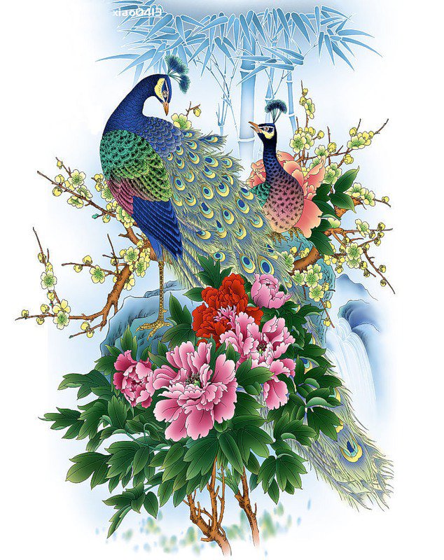Теги: птицы, цветы, картина, природа, павлины, живопись.