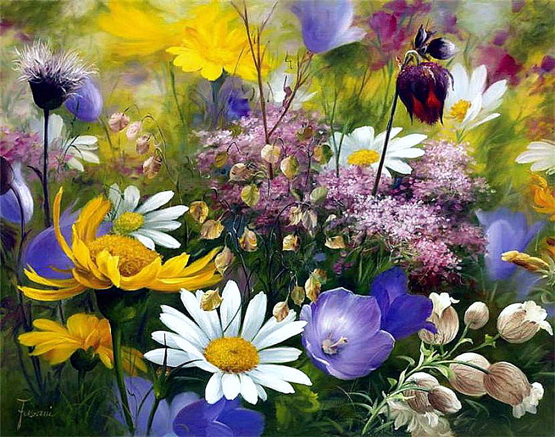 Теги: колокольчики, букет, ромашки, полевые, цветы, ваза, живопись.