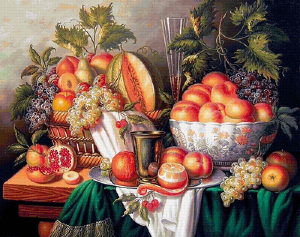 Теги: натюрморт.виноград.персики.айва.грушы.