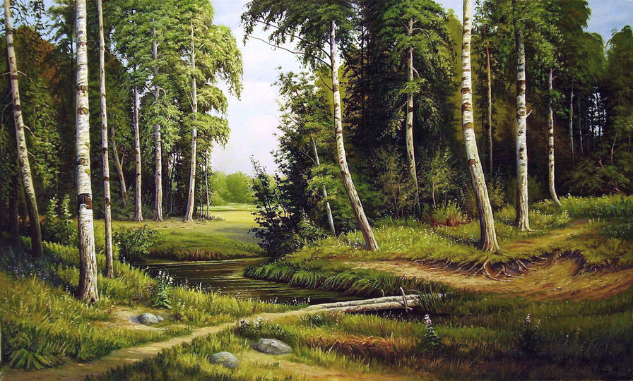 Теги: лес, лето, пейзаж, дерево, природа, живопись, сосны, река.