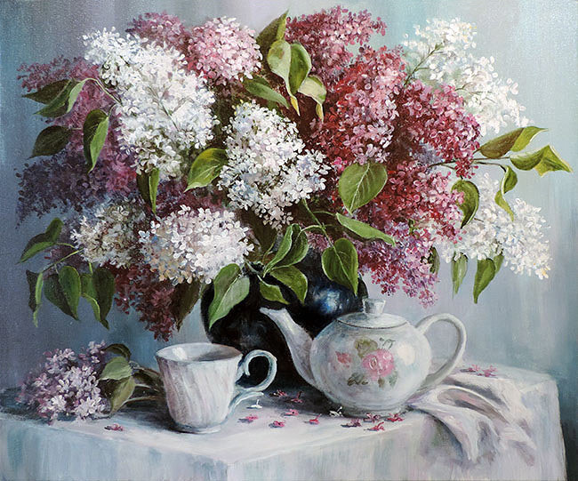 Теги: букет, живопись, цветы, розы, сирень, ваза.