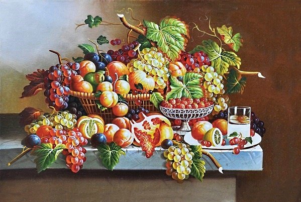Теги: виноград, персики, натюрморт, ананас, цветы, живопись, фрукты.