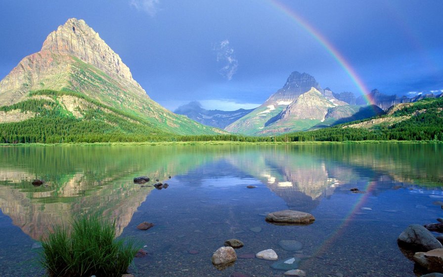 Теги: природа, закат, вода, водопад, гора, пейзаж, елки, отражение, деревья.