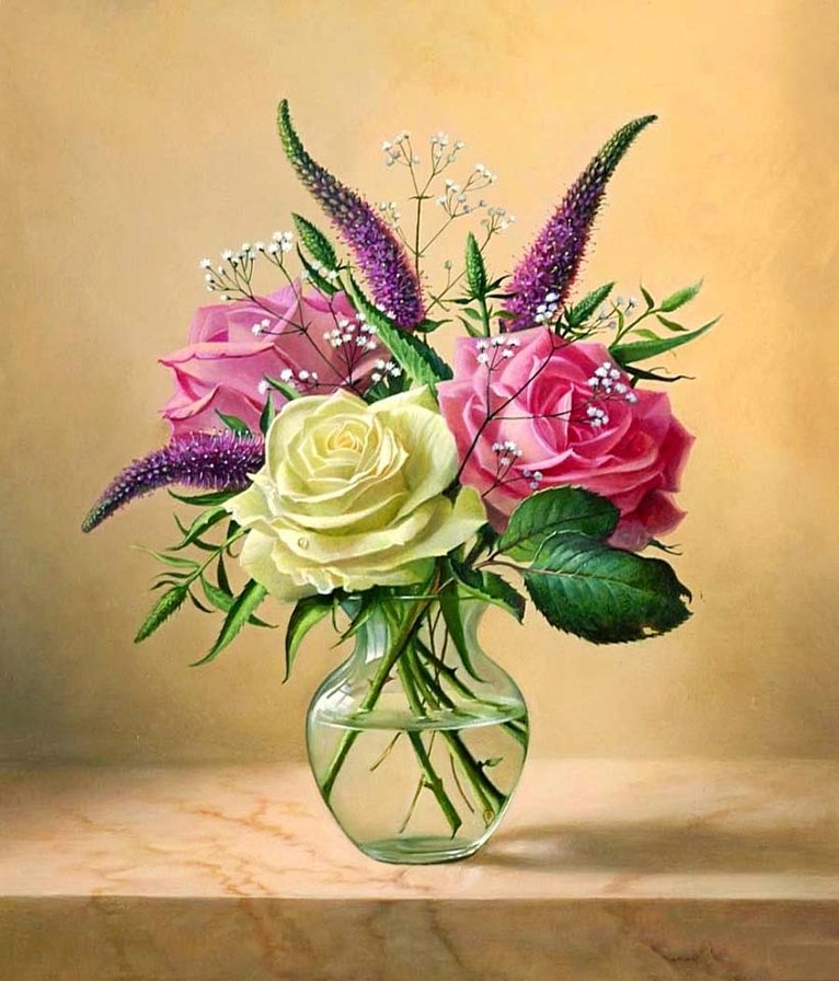 Теги: розы, цветы, натюрморт, букет, ваза, живопись.