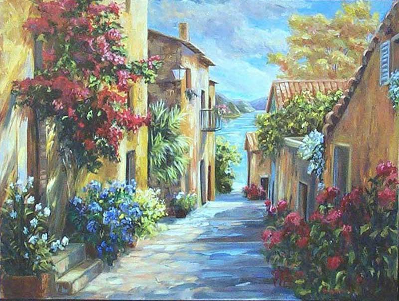 Теги: сад, живопись, дом, цветы, краски, беседка.