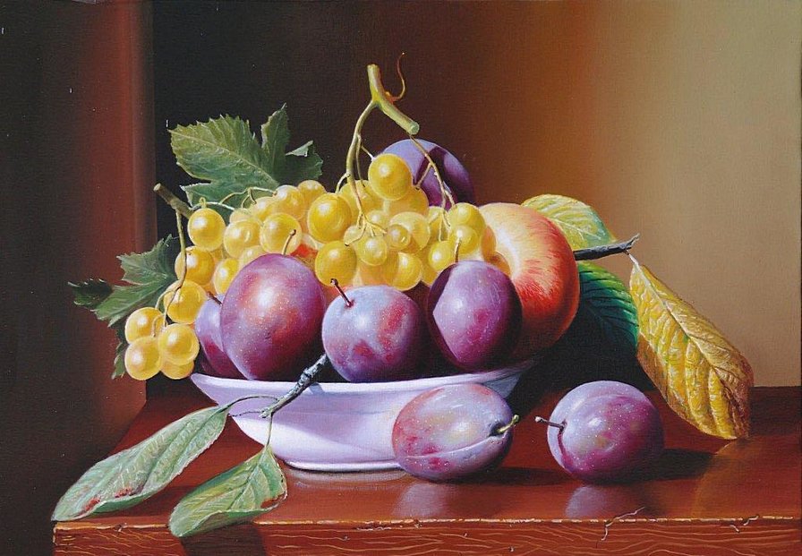 Теги: персики, виноград, сливы, кувшин, дыня, фрукты.