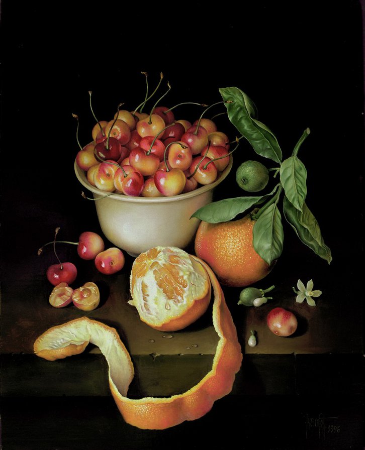 STILL LIFE - WHITE BOWL OF CHERRIES AND TWO ORANGAS 46x36 cms Oil 1996