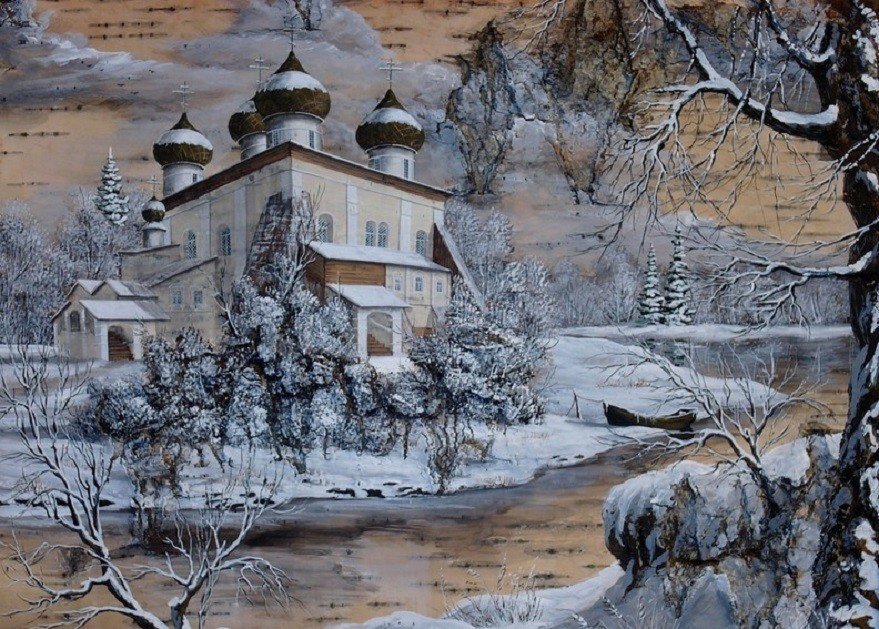 Теги: зима, зимний пейзаж, картина на бересте.