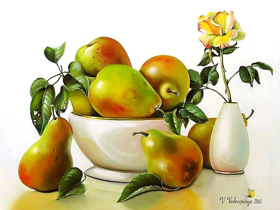 Теги: натюрморт, груши, фрукты, виноград, яблоки, живопись.