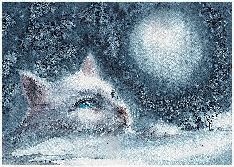 Теги: снег, елка, кошка, времена года, животные, зима.
