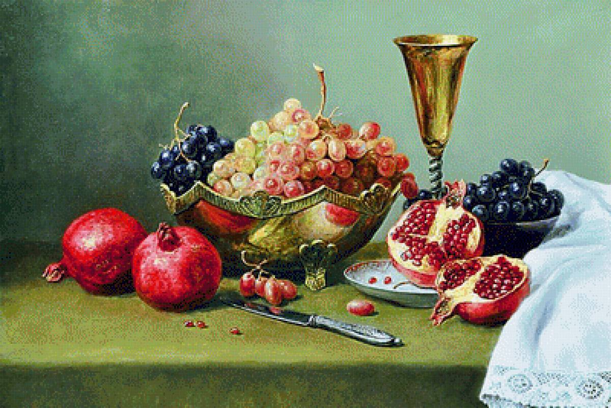 Теги: натюрморт, фрукты, цветы, живопись, гранат, виноград.