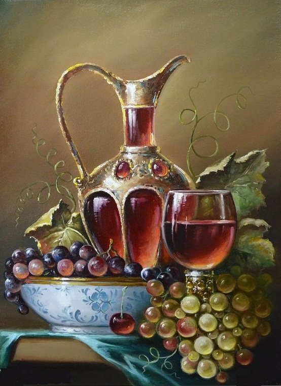 Теги: натюрморт, живопись., вино, фрукты.