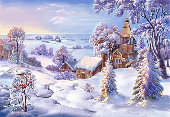 Теги: ночь, зима, снег, домик, лошади.