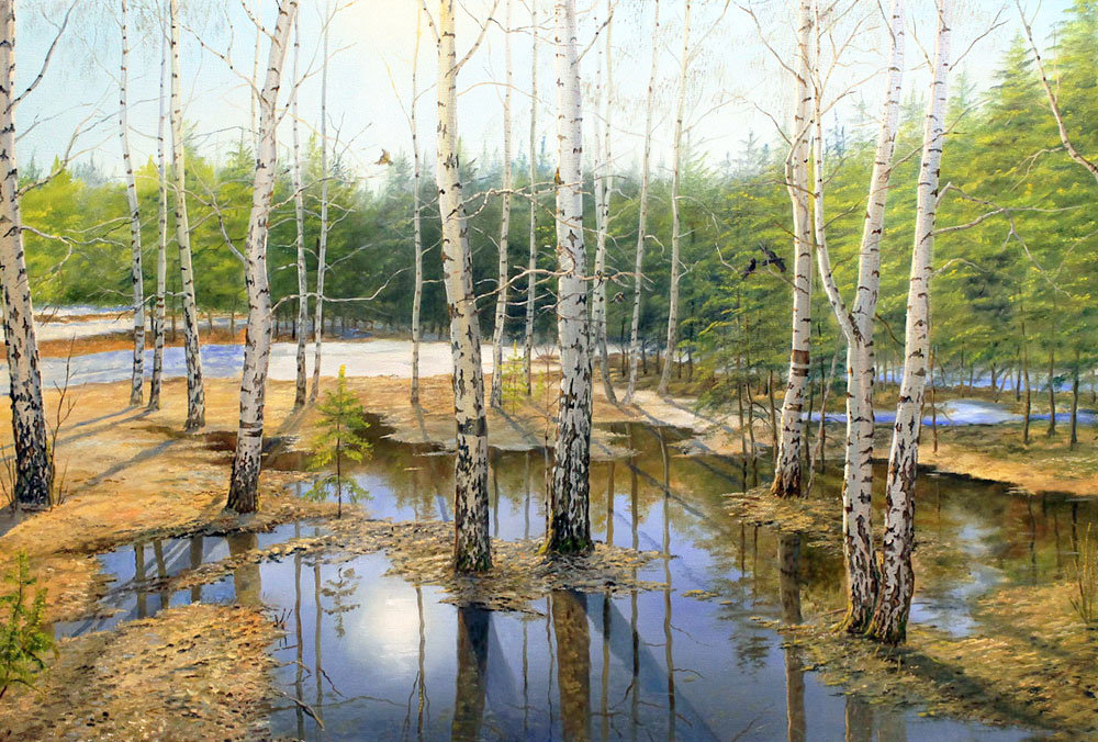 Теги: живопись, березы, природа, роща, деревья, ручей, пейзаж, весна.