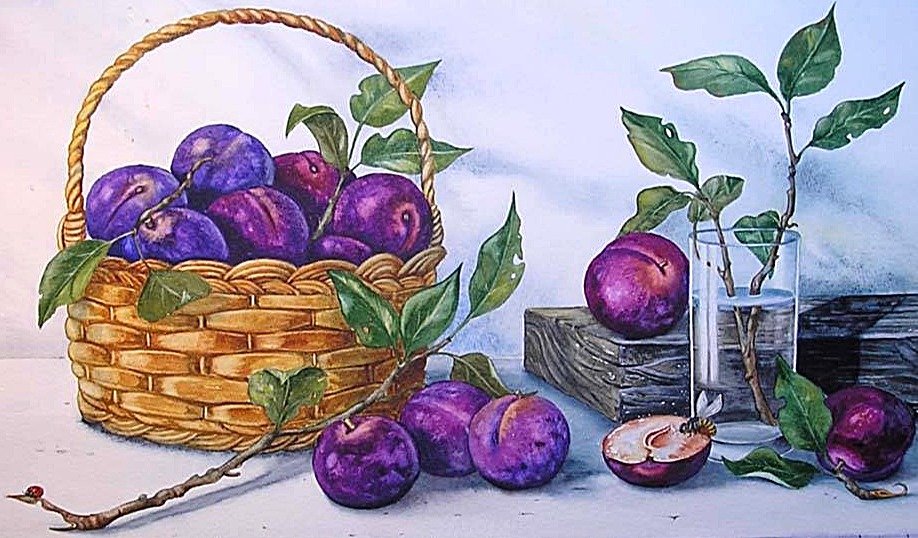 Теги: натюрморт, живопись., пчела, сливы.