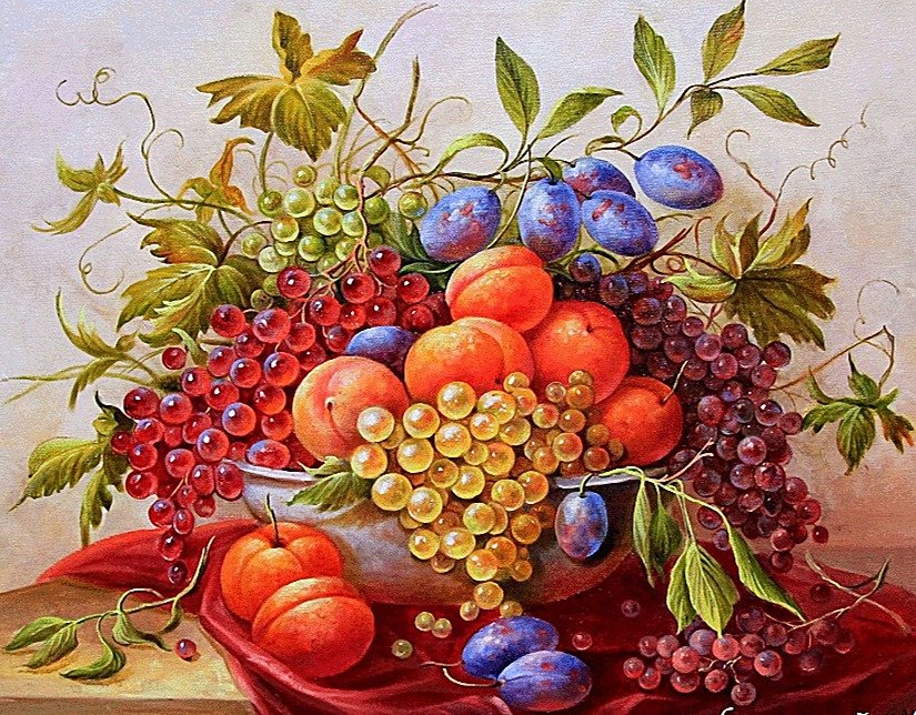 Теги: фрукты, яблоки, натюрморт, виноград.