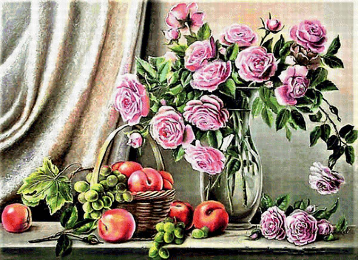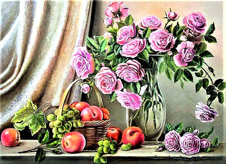 Теги: цветы, живопись, натюрморт, розы, виноград.