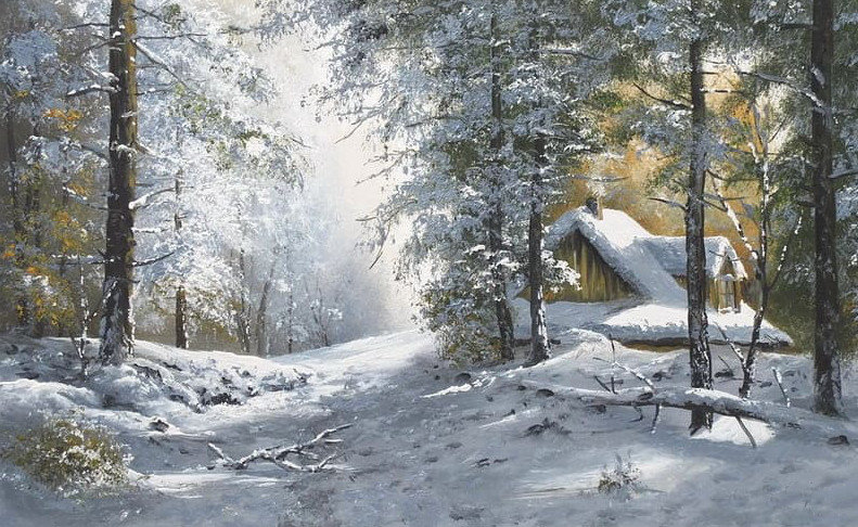 Теги: тед хермит, избушка, река, снег, домик, зима, дорога, церковь, лес, дымка.