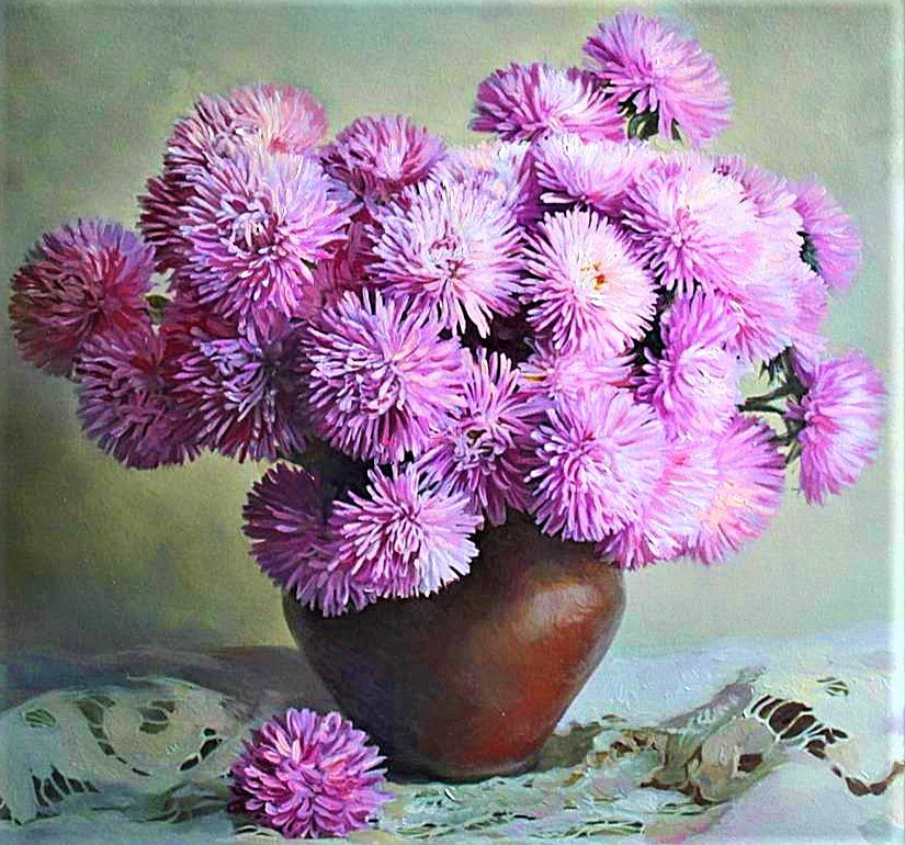 Теги: натюрморт, цветы, хризантемы, букет, корзина.