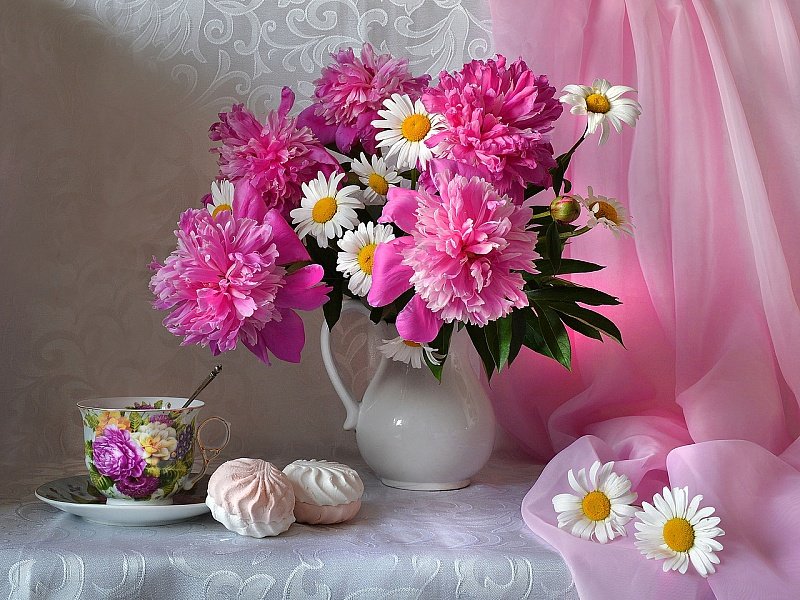 Теги: натюрморт, живопись, гобелен, цветы. ваза, розы, ромашки, пионы.