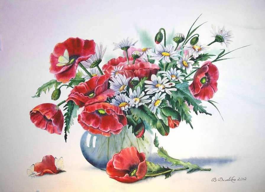 Теги: букет, маки, цветы, живопись, ромашки, колокольчики, ваза.