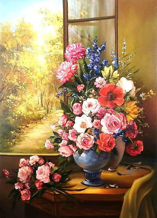 Теги: натюрморт, живопись, пионы, окно, цветы, весна, букет, ваза.
